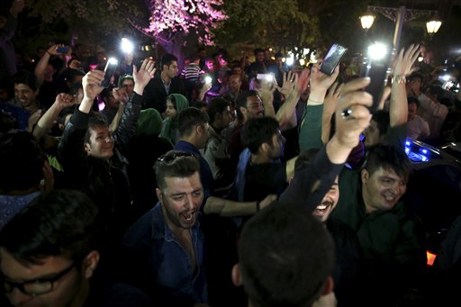 Iranians celebrate a framework agreement on Iran's nuclear program between their country and six world powers, in a street in Tehran on Friday |